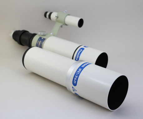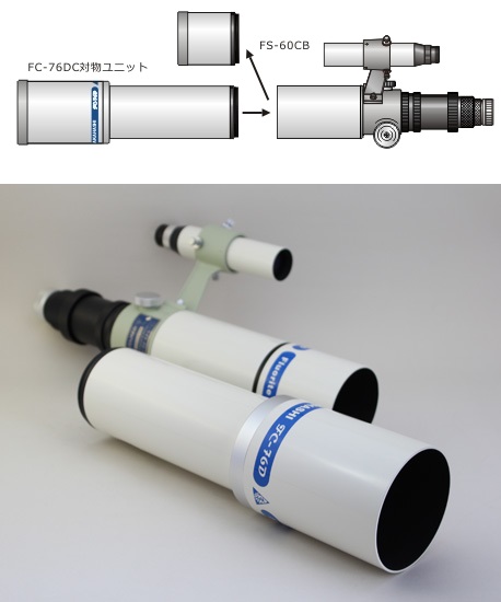 Mit diesem FC-76 Objektiv-Modul ist es möglich, einen FS-60CB zu einem FC-76DCU aufzurüsten. Der kurze Tubus mit Okularauszug wird vom FS-60CB übernommen, lediglich das Objektiv mit der Taukappe wird abgeschraubt. Man kommt so mit überschaubaren Kosten zu einer leistungsfähigeren Optik mit 76/570mm (f/7,5).