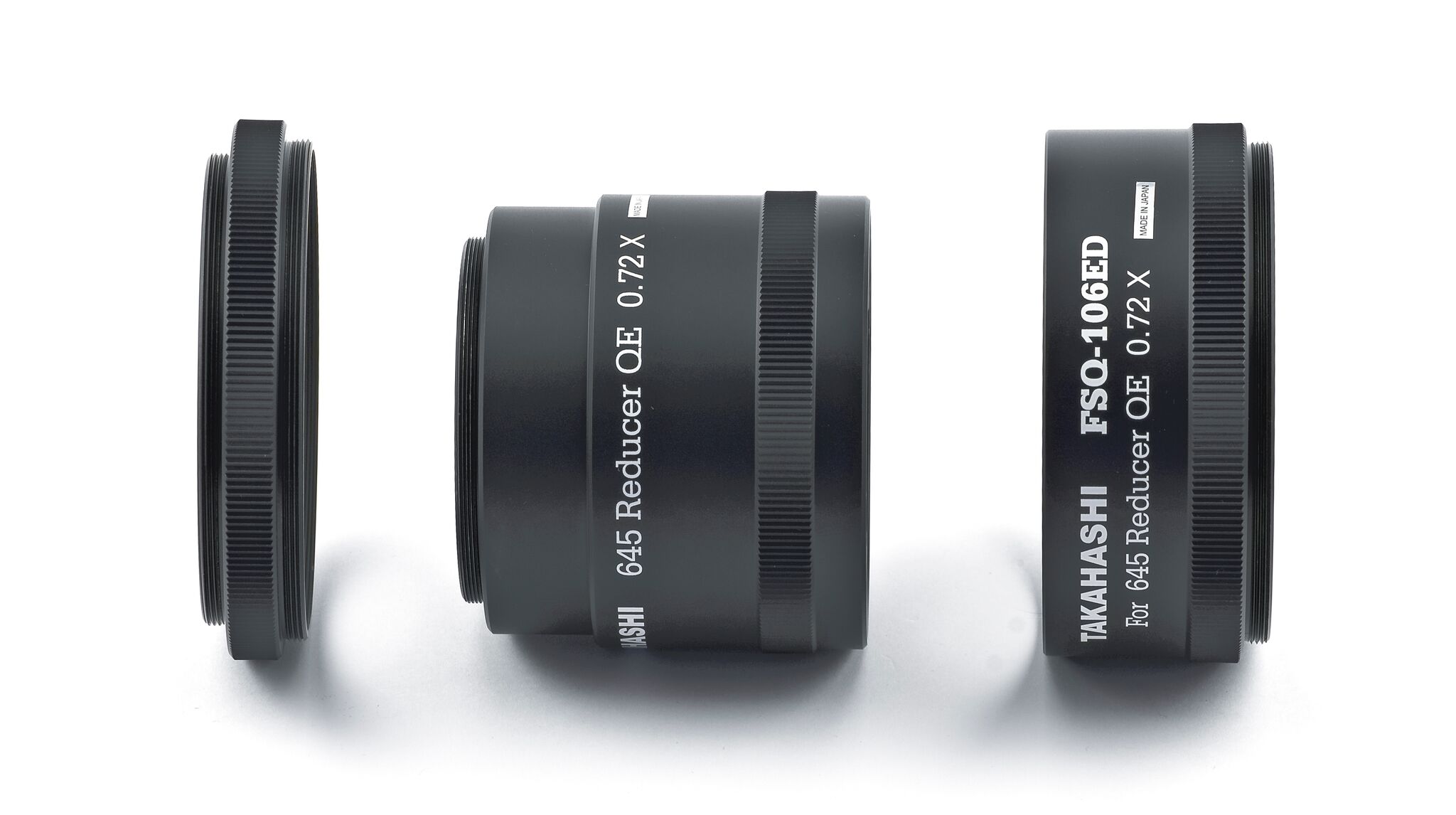 Dieser große Reducer ist speziell für den FSQ-106ED und FSQ-106EDX4 konstruiert und bis zum 6x4,5 Mittelformat geeignet. Er reduziert die Brennweite um den Faktor 0.72x auf lichtstarke 380mm (Blende f/3.6), der optische Aufbau besteht aus 4 Linsen in 4 Gruppen. Er erzeugt einen immens großen Bildkreis von 60mm, das sind bei 380mm Brennweite fast 9° Feld, ein herausragendes Setup! Auch die Ausleuchtung ist extrem gut, bei Vollformat sind das 90%, etwa doppelt so hoch wie beim Reducer-QE 0.73x, selbst am Rand, 30mm abseits der Achse, sind es immer noch 70%!