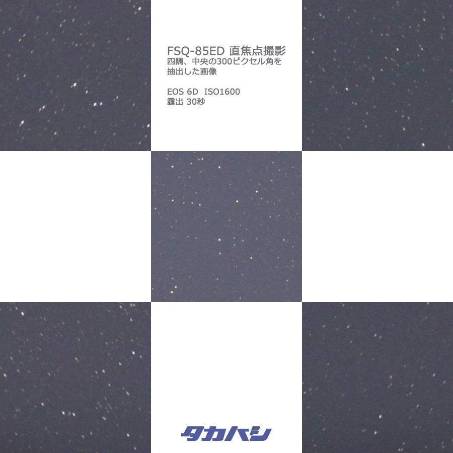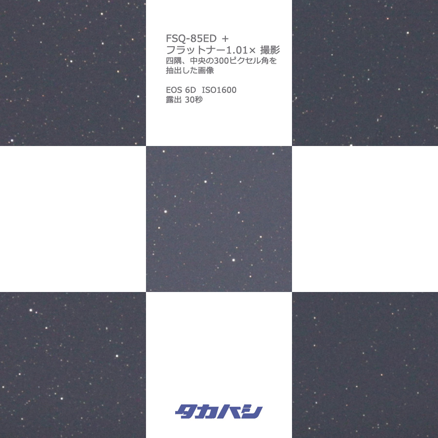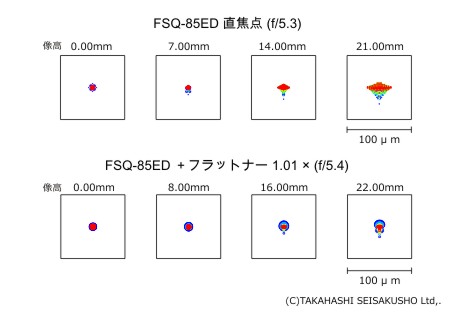Dem ständigen Wunsch nach größeren Kamera-Chips entgegnet Takahashi mit einem neuen Flattener für den FSQ-85. Die Chips werden aber auch immer hochauflösender, bei Vollformat-Kameras mit kleinen Pixeln, wie z.B. bei der Nikon D810a, werden schon recht hohe Anforderungen an die Optik gestellt. Dieser neue Flattener ebnet das Bildfeld weiter und korrigiert zusätzlich den Astigmatismus, die Brennweite wird minimal auf 455mm (f/5,35) verlängert. So ist der kleinste FSQ auch ohne Kompromisse Vollformat-tauglich, beachten Sie dazu auch das Spot-Diagramm links sowie die Vergleichsaufnahmen mit einer Canon EOS 6D bei den Bildern.
