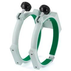 Rohrschellenpaar für den Epsilon-180ED, Durchmesser 232mm, inklusive kurzer Top Plate zur Montage von Leitrohren oder anderem Zubehör. Die hochwertigen Rohrschellen sind sehr massiv, der Tubus wird mit großen, auch mit Handschuhen gut greifbaren Klemmschrauben geklemmt.
