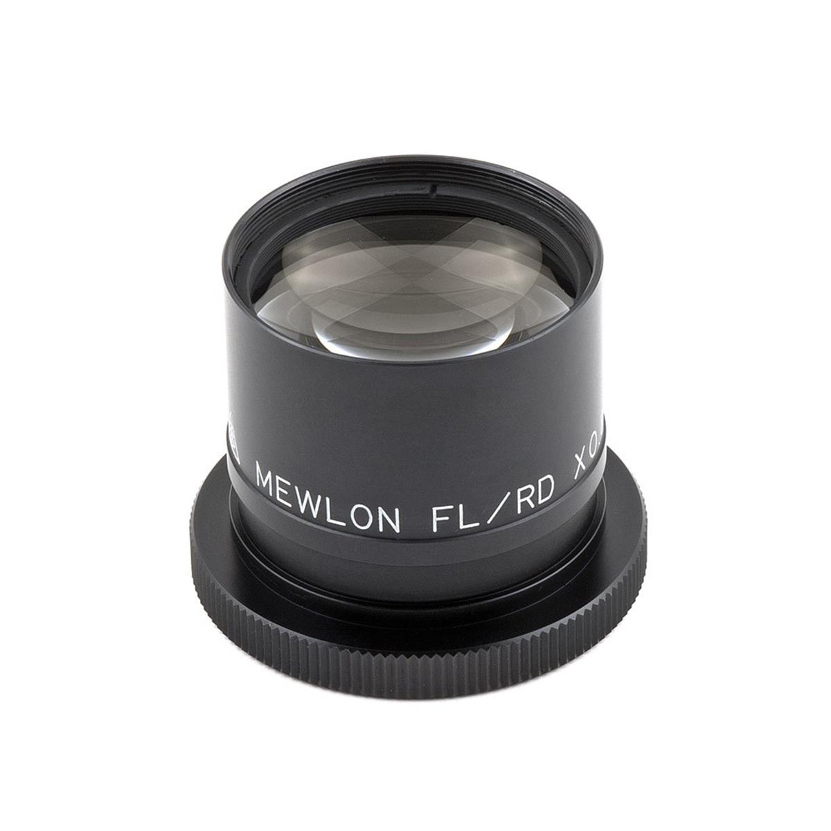 Dieser Reducer verkürzt die Brennweite um den Faktor 0.8x, zusätzlich korrigiert er aber auch das Koma am Bildfeldrand, beim Einsatz der beiden kleineren Mewlon Geräte für DeepSky-Fotografie, ist dieser Korrektor daher sehr zu empfehlen. Die Brennweite wird beim Mewlon-180 auf 1763mm (f/9,8) reduziert, beim Mewlon-210 erreicht man 1961mm (f/9,3). Der Anschluss erfolgt denkbar einfach, fernrohrseitig wird er einfach über 2 Zoll angeschlossen, kameraseitig wird direkt ein Wide T-Mount Bajonettring angeschraubt. Mit dem M54pM48p-Adapter kann über passende Distanzringe auch der Anschluss einer CCD-Kamera erfolgen.