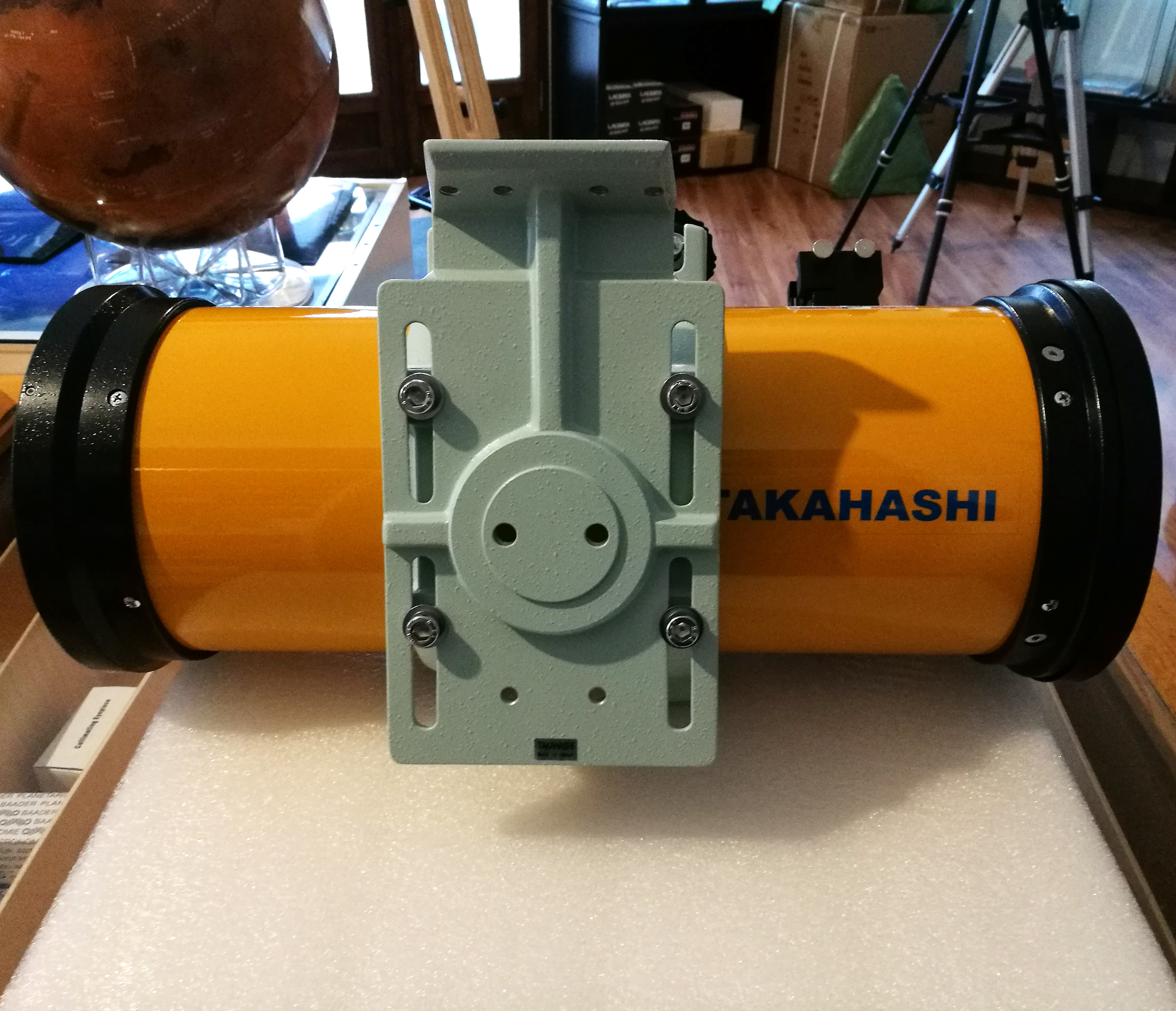 Takahashi bietet Montageplatten in drei verschiedenen Größen an. Die kleinste Version hier ("Mounting Plate S", TMP02300) passt zum Epsilon-130D, Epsilon-180ED mit der kurzen Top Plate, sowie zum FSQ-106ED mit den Doppelrohrschellen TKA36420W .