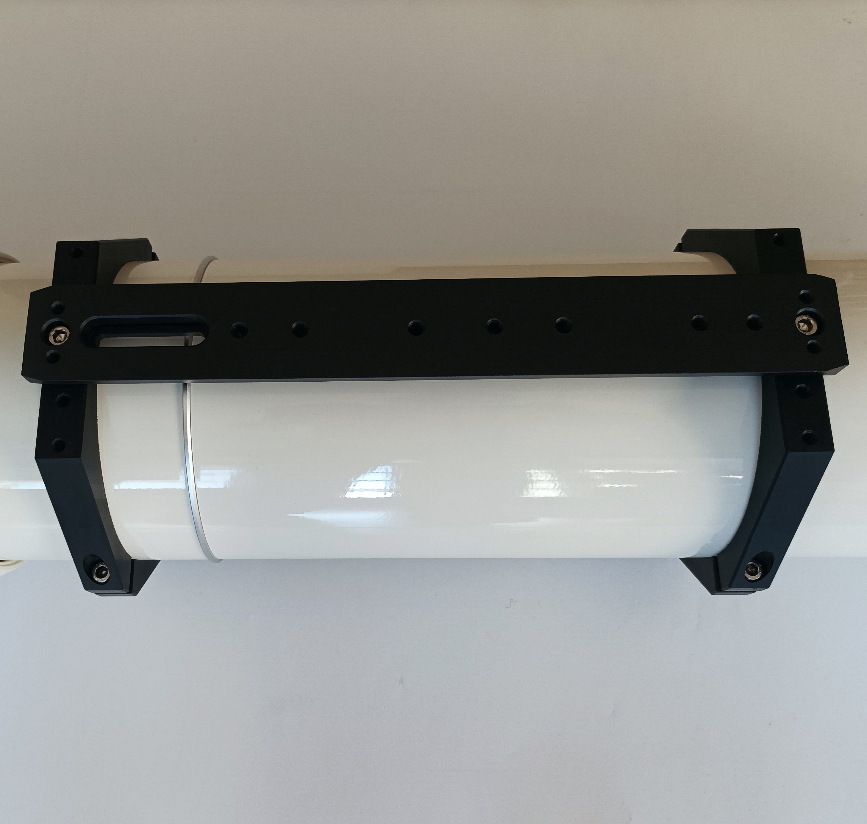 an, unten Losmandy für die Montierung, oben Vixen für weiteres Zubehör und als Tragegriff. Die Schellen werden über M6-Schrauben sicher geklemmt, jede Schelle