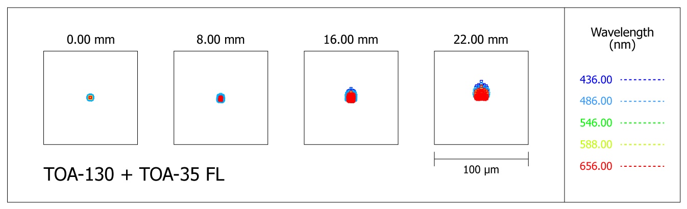 Der neue 0,7x Reducer (TKA32580) reduziert die Brennweite auf 700mm (f/5.4), der 4-linsige Aufbau (2 Linsen mit ED-Glas) verspricht auch bei Vollformat-Chips eine makellose Sternabbildung in den Bildecken. Die Spotdurchmesser sind in der Bildmitte nur 3 Mikrometer groß, in den Bildecken maximal 6 Mikrometer, nur wenige Geräte am Markt besitzen eine derartige Performance!