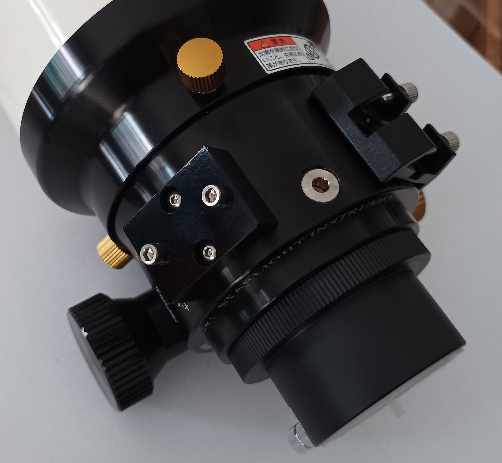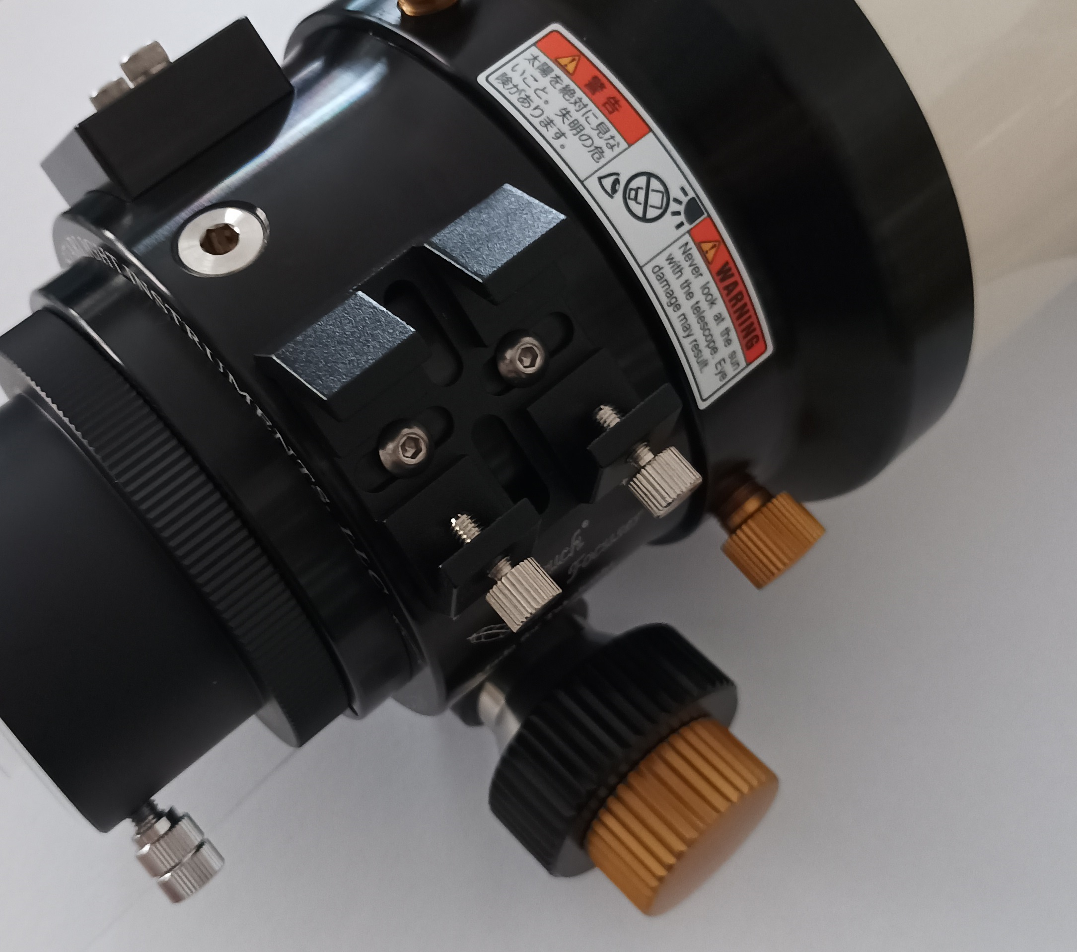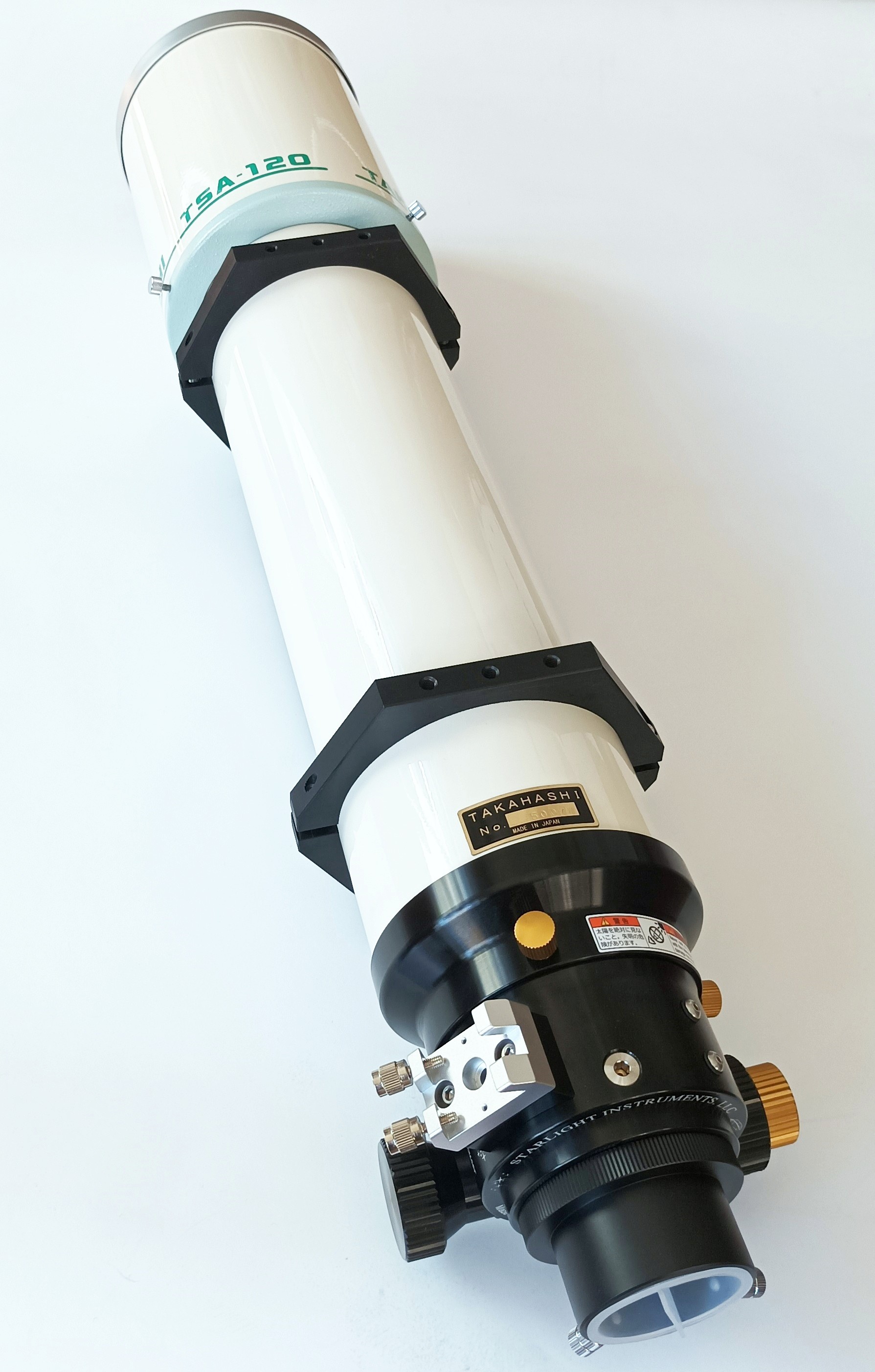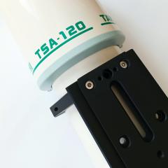 Dieses Sondermodell besitzt einen hochgenauen Feather Touch Auszug mit 3 Zoll Durchmesser. Über die Qualität dieser Auszüge muss nicht mehr viel gesagt werden, Starlight ist hier klarer Marktführer. Im Vergleich zum originalen 2.7" Zahnstangenauszug von Takahashi bietet dieser Auszug mehr Genauigkeit, eine leichtere Verstellung (vor allem bei hohen Zuladungen) und ab Werk einen Mikrofokus. Außerdem ist der komplette Auszug voll rotierbar. Das rückseitige Gewinde ist ebenfalls M72, daher kann das komplette Zubehör-Programm des TSA-120 wie im Systemdiagramm angeschlossen werden.