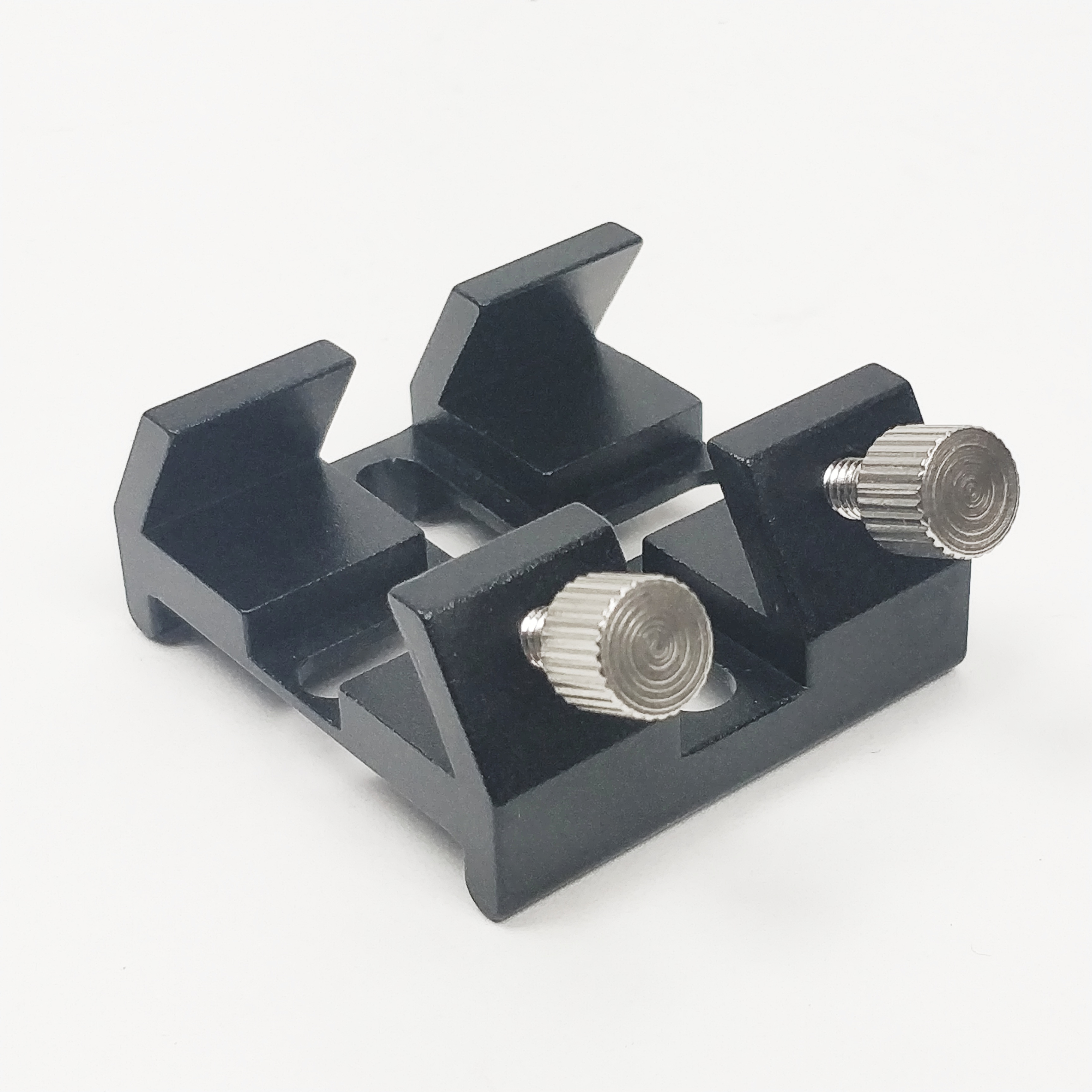 Vier Langlöcher (2x länglich, 2x quer) bieten optimale Befestigungsmöglichkeiten. Die Abstände der Bohrlöcher können von 10 mm bis 28,5 mm variieren. Durch zwei Seitenstege liegt der Sucherschuh sicher sowohl auf flachen Auflageflächen als auch gekrümmten Flächen auf. Tuben ab einen Durchmesser von 90mm können sehr gut mit dem Sucherschuh bestückt werden.