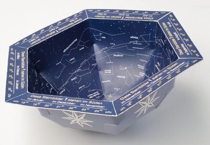 Aus diesem Kartonbausatz können Sie sich eine dreidimensionale Kuppel-Sternkarte bauen: ein Planetarium für zu Hause (Durchmesser 52cm, oder 25,5cm). Anders als flache Sternkarten bietet der 3D-Sternenhimmel eine nahezu verzerrungsfreie großformatige Darstellung aller bei uns sichtbaren Sternbilder und Sterne, mit Datums- und Uhrzeitangaben am Rand zum raschen und einfachen Auffinden der Gestirne am Himmel.