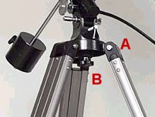A) Verbindung der Stativbeine mit der Stativplatte B) Mittelschraube an der Unterseite der Montierung, hier wird die Montierung auf die Montierungsplatte aufgesetzt, und verschraubt. |