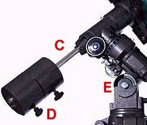 C) Gegengewichtsstange, auf dieser werden die Gegengewichte befestigt, und können auf ihr verschoben werden, so dass das Gewicht gut ausbalanciert werden kann. D) Das/die Gegengewicht(e). E) Polhöhenskala, hier kann man ablesen auf welche Höhe die Polachse eingestellt ist. |