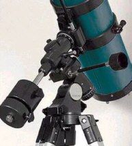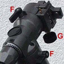 F) Feststellhebel für die Dec- und Ra-Achsen, diese können gelöst werden, dann kann das Teleskop grob ausgerichtet werden, und nach dem erneuten Feststellen wird dann mittels der Nachführung genau ausgerichtet (entweder per Motorisierung, oder wie hier bei punkt G) Manuelle Verstellung der Dec-Achse, diese gibt es dann auch noch für die RA-Achse, hiermit wird genau auf das zu beobachtende Objekt gestellt, und dann beim Beobachten auch nachgeführt. |