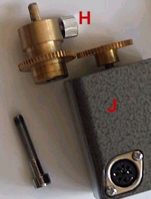 Motorisierung für die Nachführung (falls vorhanden) H) Zahnwelle, diese ersetz die Welle, mit der von Hand nachgeführt/eingestellt wird. J) Nachführmotor, dieser steuert die Welle an, und dreht somit die Achsen. |