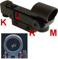 Lasersucher Dieser projiziert einen Leuchtpunkt auf eine Mattscheibe. Wenn das Objekt mit dem Leuchtpunkt übereinander liegt, dann ist es auch im Okular zentriert (wenn der Sucher richtig eingestellt ist) K) Sucherbasis, hier wird der Sucher auf dem Teleskop montiert L) Stellschraube um den Laserpunkt nach oben/unten zu justieren M) Wie L, nur für links/rechts |
