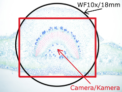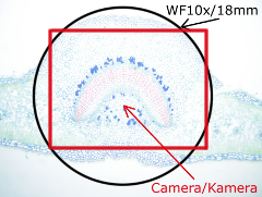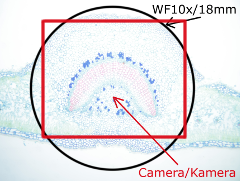 Die Kamera wurde auf automatischer Beleuchtung und Weissabgleich eingestellt um zu sehen, wie sie reagiert, wenn die Präparate einmal mit optimaler, einmal mit minimaler Lichtstärke beleuchtet werden. Das wenig Licht kompensierte die Kamera automatisch mit längeren Expositionszeiten und höheren Gain-Werte, die Qualitätsunterschiede treten beim Betrachten des Bildrausches in Vorschau. Die Qualität einer Kamera ist umso besser, desto weniger Unterschiede (Bildrausch, Kontrast, Farbechtheit) zwischen optimal und unterbeleuchtete Testfotos zeigt (für die volle Auflösung bitte ans Bild klicken!). Beachten Sie auch die Größe des abgebildeten Feldes: das visuelle Gesichtsfeld durch einem 10x/18mm Okular ist mit schwarzem Kreis markiert.