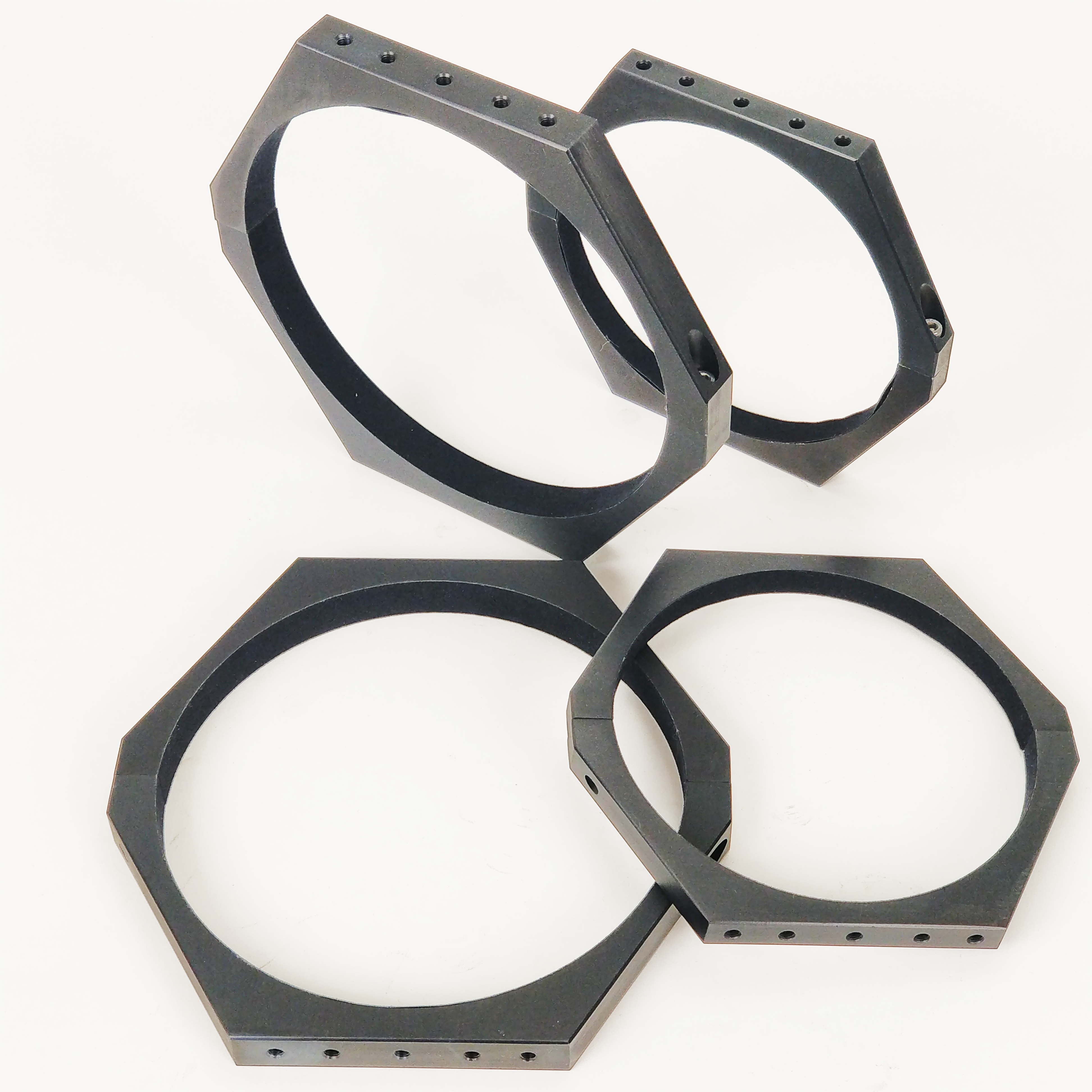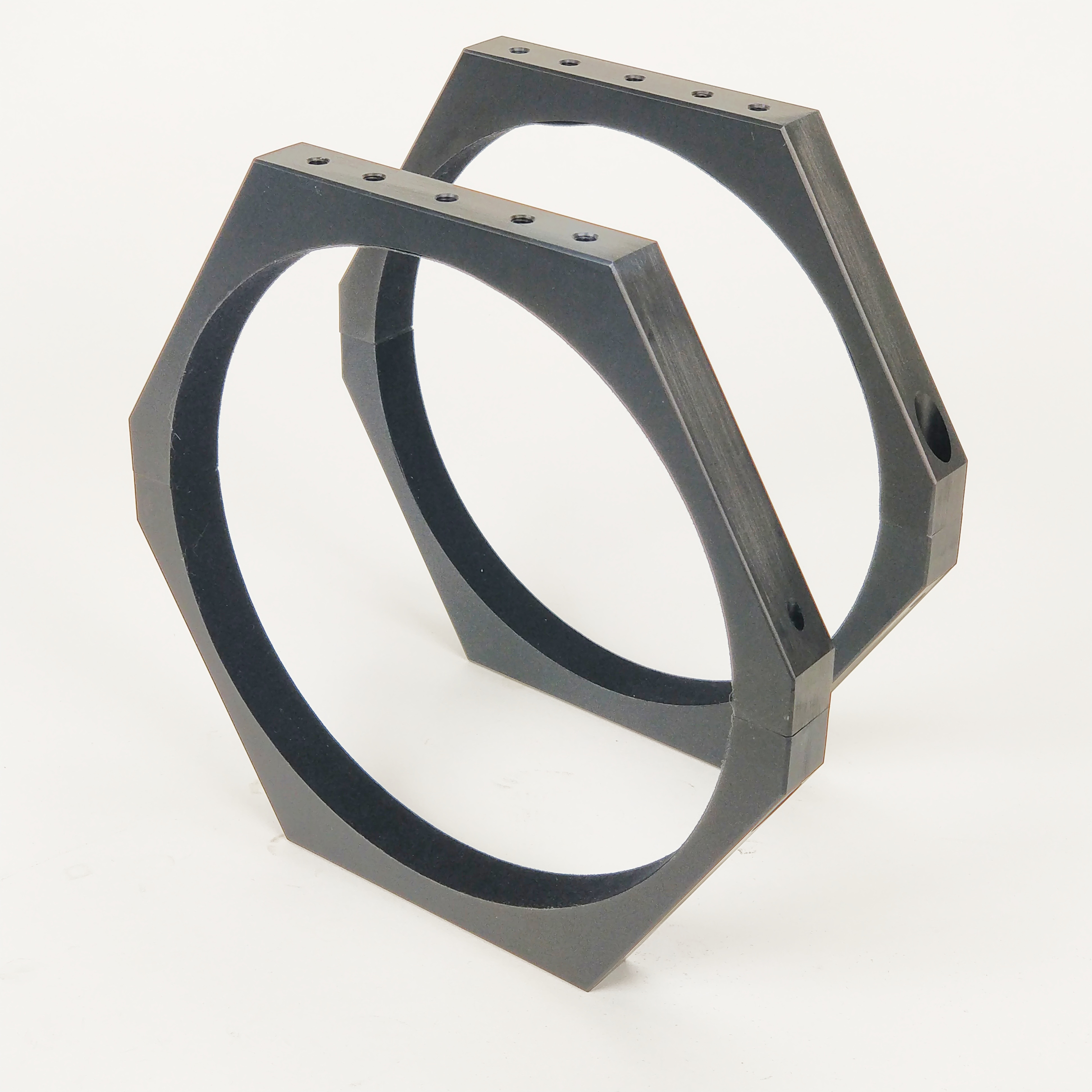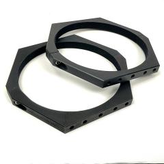 Sechseckige Rohrschellen in modernem Look, 20mm breit, schwarz eloxiert, mit Velour ausgekleidet, mit je 5 M6 Gewinden oben und unten - vielfältige Anbaumöglichkeiten!