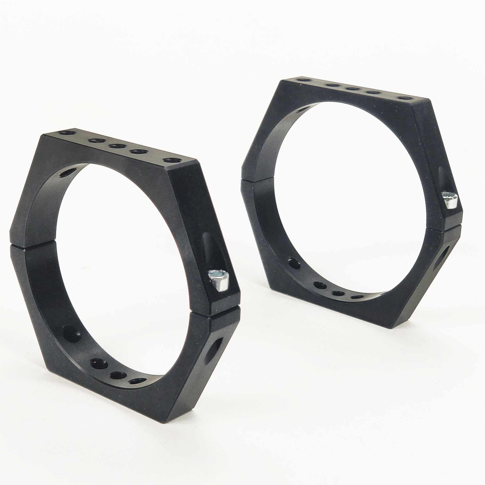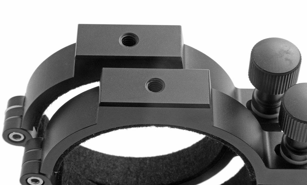 Jede Schelle hat unten und oben mehrere M6-Innengewinde für eine flexible Montage, die Klemmung der Schellen erfolgt mit Inbus-Schrauben. Kommt mit eingeklebtem Velour, um den Tubus nicht zu zerkratzen.