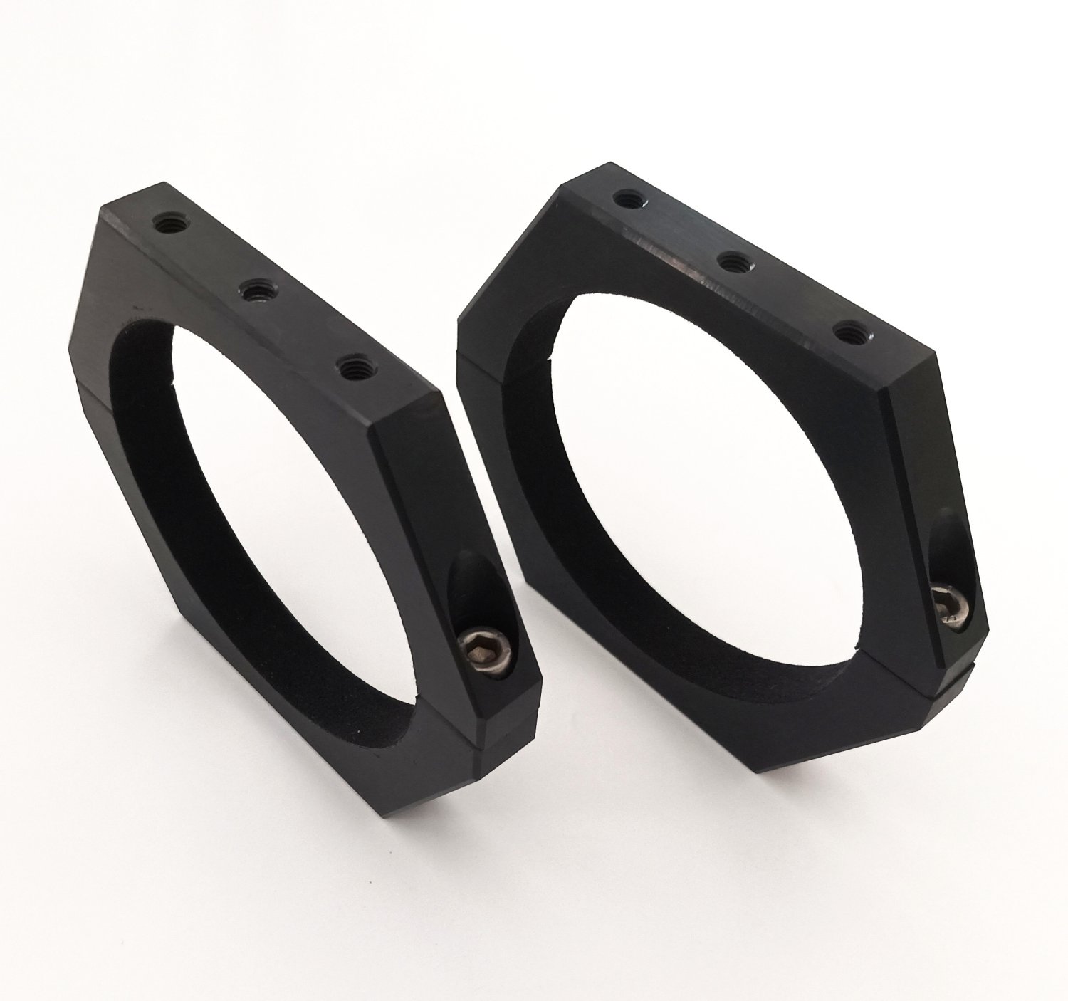 Sechseckige Rohrschellen in modernem Look, schwarz eloxiert, mit Velour ausgekleidet, Breite 15mm, mit mehreren M6-Innengewinden oben und unten.